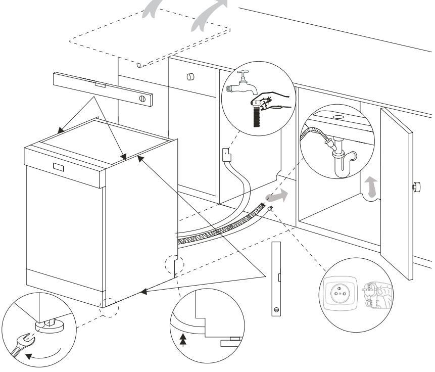 Wąż odprowadzający wodę można podłączyć bezpośrednio do odpływu wody lub do króćca wylotowego zlewozmywaka. Wodę można odprowadzić również bezpośrednio do zlewozmywaka stosując specjalny uchwyt (jeżeli jest dostępny), zahaczając wygiętą rurę na jego krawędzi. Podłączenie powinno być na wysokości co najmniej 50 cm i maksymalnie 110 cm mierząc od płaszczyzny podłogi.