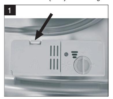 Stosować sól zmiękczającą przeznaczoną do zmywarek. Aby nasypać soli zmiękczającej należy najpierw wyjąć dolny kosz, a następnie otworzyć pokrywę dozownika soli obracając ją w lewo - (1). Na poczatek nanetnić dozownik do pełna sola