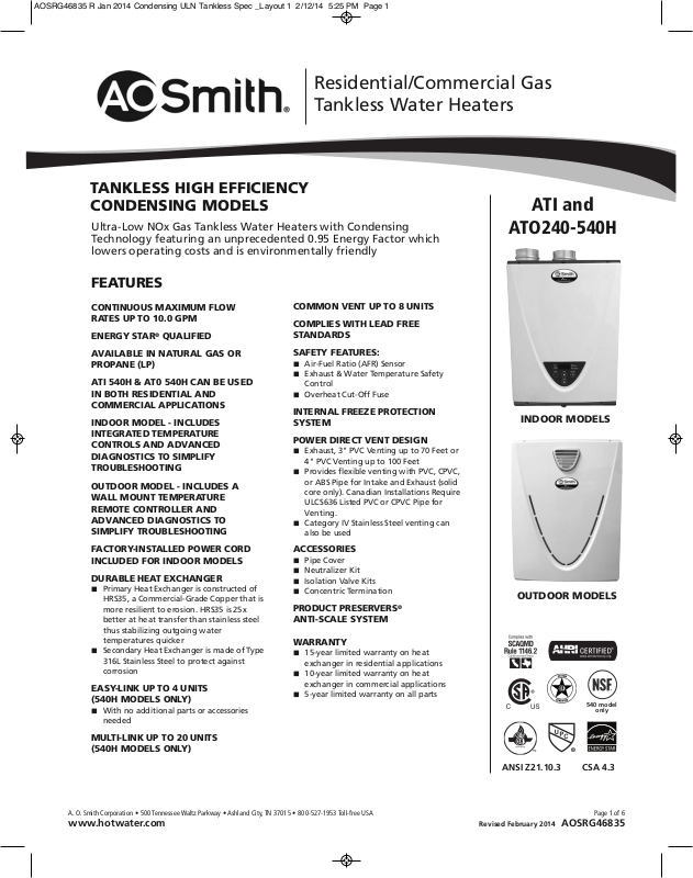 A. O. Smith Corporation • 500 Tennessee Waltz Parkway • Ashland City, TN 37015 • 800-527-1953 Toll-free USA Page 1 of 6