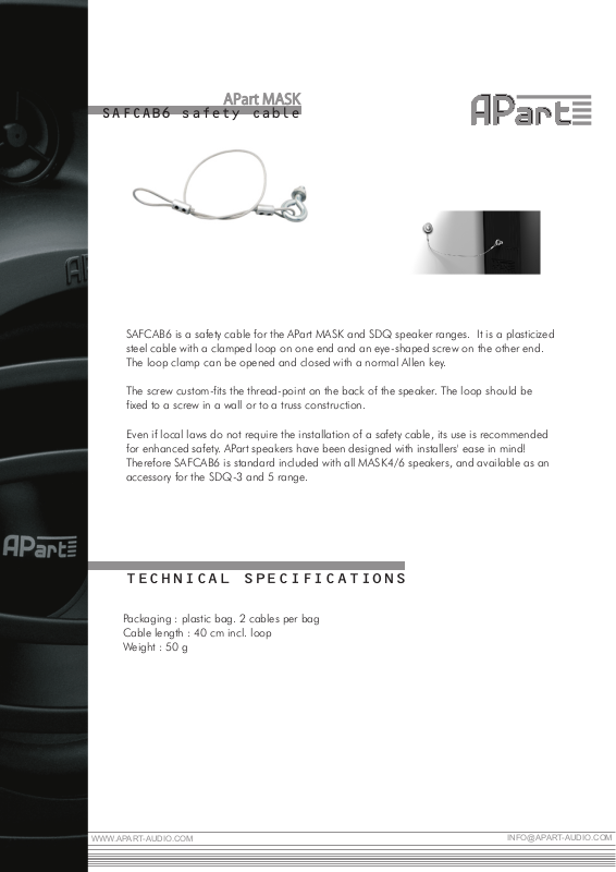 SAFCAB6 is a safety cable for the APart MASK and SDQ speaker ranges. It is a plasticized