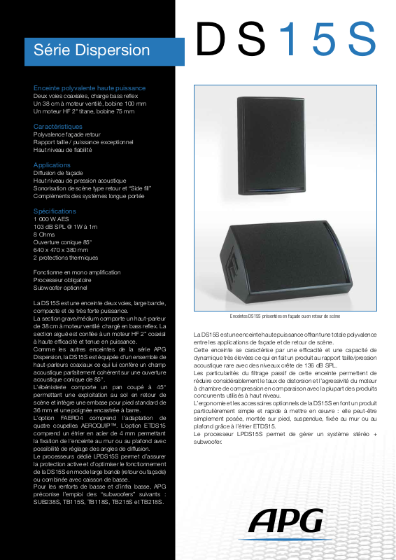 voies en DS15S éventuellement combinées avec des “subwoofers” APG. Ce processeur comporte les