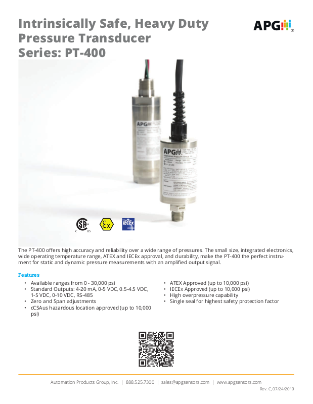 wide operating temperature range, ATEX and IECEx approval, and durability, make the PT-400 the perfect instrument for static and dynamic pressure measurements with an amplied output signal.