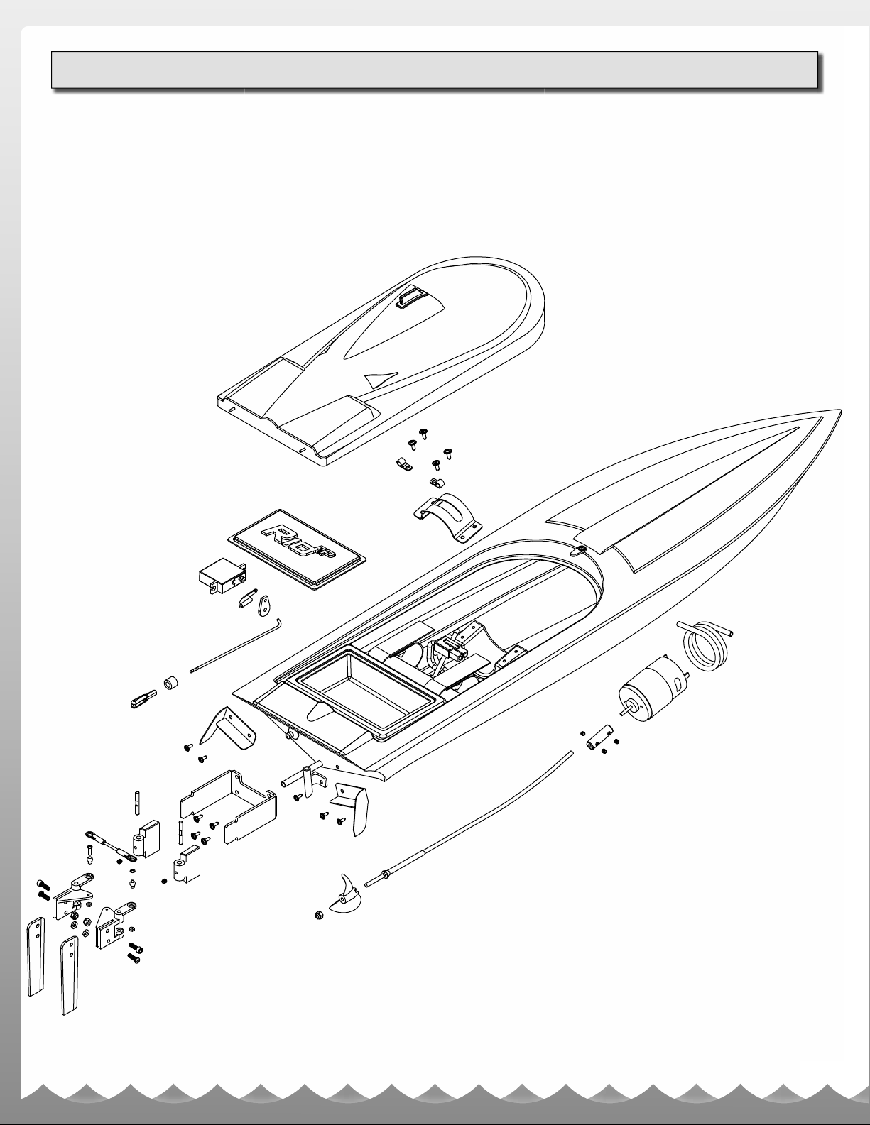 ESC — which, like the motor, is water-cooled. The on-board servo and linkage of the included 2-channel radio are factoryinstalled. And AquaCraft adds many premier accessories from their GrimRacer line: a machined aluminum surface drive