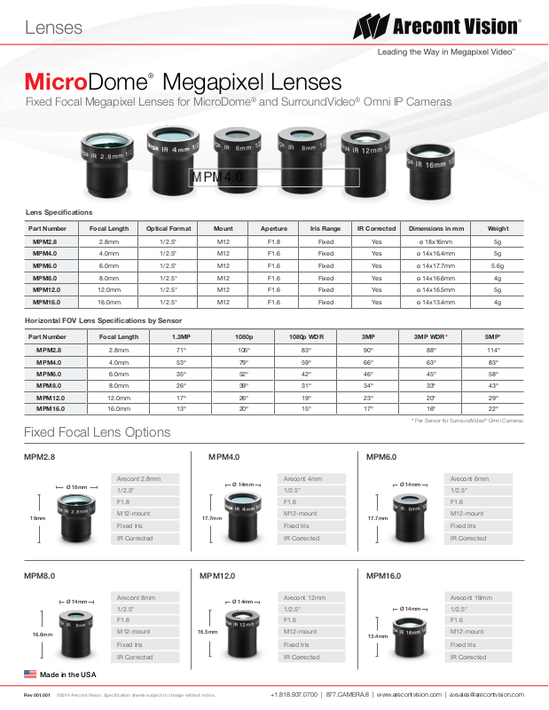 Rev 001.001 ©2014 Arecont Vision. Specification sheets subject to change without notice.