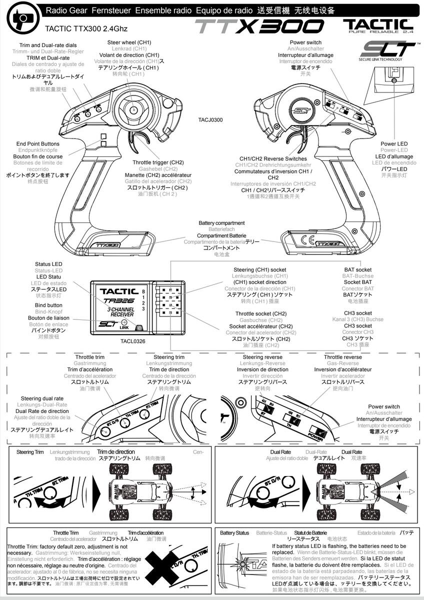 Vorsicht: Bei der Verwendung des falschen Akku-/Batterietyps kann es zu Explosionen kommen. Entsorgen Sie alte Akkus/Batterien immer entsprechend den beiliegenden Instruktionen 1. Verwenden Sie lediglich vier (4) AA-Alkali Batterien in Ihrem TTX300-Sender 2 Akkus/Batterien nicht ins Feuer werfen Explosionsgefahr! Befragen Sie im Zweifel Ihr lokales Entsorgungsunternehmen oder Ihren Fachhändler bezüglich der korrekten Entsorgung von alten/defekten Akkus/Batterien. 3. Offenen oder Beschädigen Sie auf keinen Fall Akkus/Batterien. Austretendes Elektrolvt ist ätzend und kann in Kontakt mit Augen und/oder Haut zu Verätzungen führen. Toxisch beim Verschlucken 4. Vermeiden Sie Kurzschlüsse und seien Sie Vorsichtig, wenn Sie Ketten oder Ringe tragen, da auch diese Kurzschlüsse hervorrufen können. Akkus oder leitendes Material kann heiß werden und Verbrennungen hervorrufen. Attention: Risque d'explosion si la batterie est remplacée par un type de batterie incorrect. Jetez les piles usagées selon les instructions. 1. Utilisez uniquement guatre (4) piles alcalines AA dans votre émetteur de TTX300. 2. Ne jetez pas la batterie au feu car elle pourrait exploser. Vérifiez les consignes local des déchets pour connaître la procédure d'élimination. 3. Ne pas ouvrir ni mutiler les piles. L'électrolyse est corrosive et peut causer des dommages aux yeux et sur la peau. Elle peut être toxique si elle est 4. Faire preuve de prudence lors de la manipulation des piles afin de ne pas court-circuiter avec des matériaux conducteurs tels que baques, bracelets et clés. Les batteries ou la conduction peuvent surchauffer et causer des brûlures Precaución: Riesgo de explosión si la batería es sustituida por otra de tipo incorrecto. Deseche las baterías usadas siguiendo las instruc-1 Utilice sólo cuatro (4) baterías alcalinas AA en su emisora TTX300 2. No deseche la batería quemándola ya que podría explotar. Compruebe las regulaciones locales para posibles instrucciones especiales para su desecho. 3. No abra ni corte la batería. El electrolito desprendido es corrosivo y podría causar daños en piel y ojos. Puede resultar tóxico en caso de ingestió 4. Ponga especial cuidado al manejar las baterías para evitar cortocircuitos con materiales conductores como anillos, pulseras o llaves. La batería o el material conductor podrían calentarse y causar quemaduras. 注意:バッテリを間違ったタイプと交換すると爆発の危険性がある。指示に従って使用済み電池を処分。 1. あなたのラジオ TTX300 で唯一の4(4)単三アルカリ電池。 1. めなだのシンオ 11,500 て唯一の年(年)ギニアルカウ電池。 2 それが爆発する可能性が燃焼することによって、バッテリーに捨てないでください。可能な特別な廃棄手順については、地域の規制を確認してくだ さい こ v 。 3. バッテリーを開けたり、不具ないでください。進化した電解液は腐食性であり、皮膚や目に損傷を引き起こす可能性があります。飲み込むと、それ は毒性であり得る。 は母はてのり待る。 そのような指輪 ブレスレットやキーなどの導雷性材料との短絡を避けるために バッテリーを取り扱うとき 4. 特別な注意を払ってください。バッテリーや導体が過熱して火傷の原因になります。 注意:爆炸危险,如果更换的电池类型不正确。按照说明处理废旧电池。 1. 只能使用 4 个 AA 碱性电池在电台 TTX300 。2. 不要通过燃烧可能发生爆炸处理电池。查阅当地有关可能的特殊处理的说明。 3. 不要打开或毁坏电池。演进的电解质有腐蚀性,可能会损害皮肤和眼睛。这可能是吞咽。4. 装卸电池,以避免短路导电材料,如戒指,手镯和钥匙要 5. 不要打开或致不电池。演近的电解应有腐蚀 特别小心。电池或导线可能会讨热并导致灼伤。
