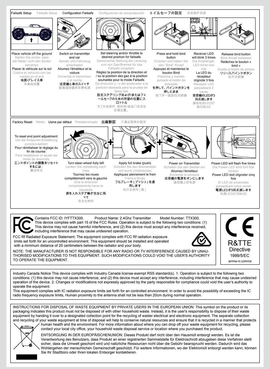 ARRMA Durango Ltd. (Teil der Hobbico Firmengruppe), Suite 3, Enterprise Glade, Moira, Derbyshire, DE12 6BA, UK. erklärt hierdurch, dass nachfolgende Artikel bei bestimmungsgemäßer Verwendung den einschlägigen Bestimmungen der EG-Richtlinien entsprechen. Erklärt, dass das Produkt: TACTIC TTX300 2.4Ghz Funkfernbedienung Sender and TACTIC TR326 2.4Ghz Funkfernbedienung Empfänger den grundlegenden Anforderungen des §3 und den übrigen einschlägigen Bestimmungen des FTEG (Artikel 3 der R&TTE) entspricht. Angewandte harmonisierte Normen: