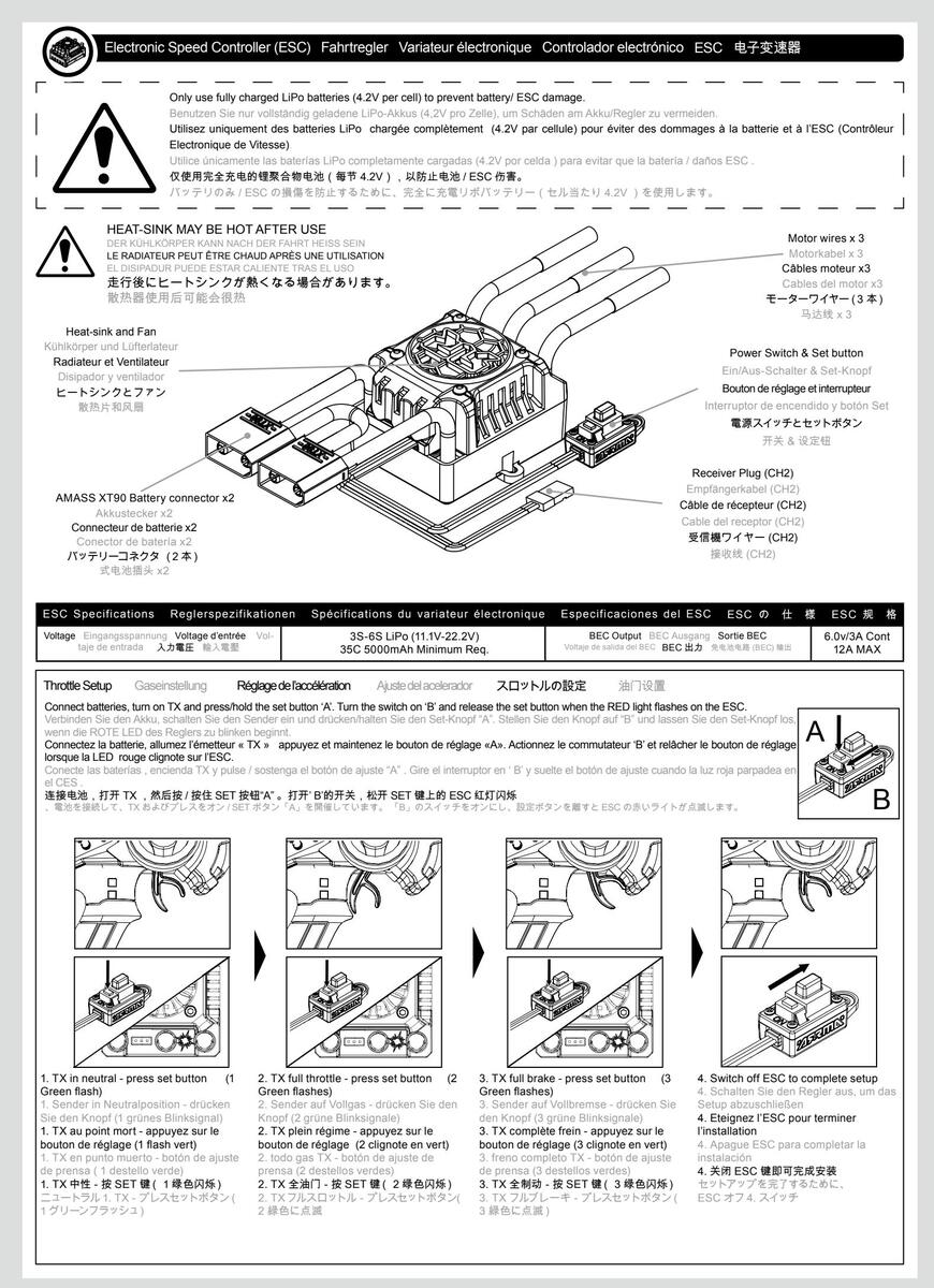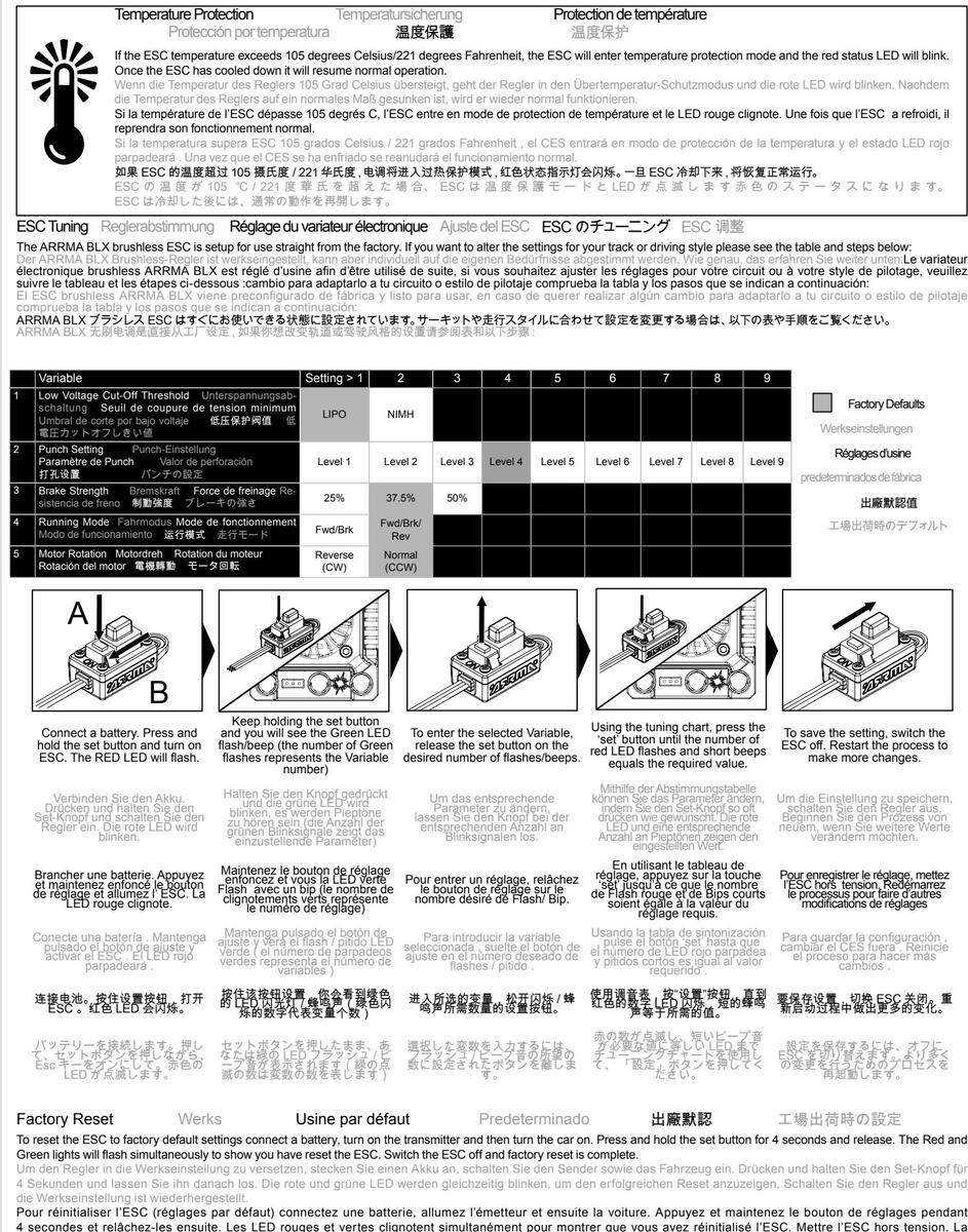 segundos y relaje. Las luces rojas y verdes parpadean simultáneamente para demostrar que ha restablecido . Cambie el CES apagado y reinicio de fábrica es completa . 要重置 ESC 到出厂默认设置连接电池,打开发射器,然后上车。按住 4 秒钟,然后松开设置按钮。红色和绿色灯将同时闪烁,以显示你已经复位。切换 ESC 关闭,恢复出厂设置就完