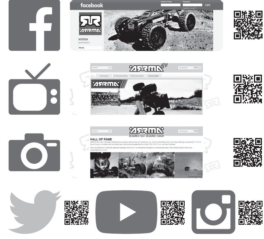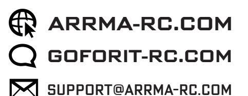 请上官网 ARRMA-RC.com 查询相关零件和升级的资讯。"GO FOR IT"是全球 ARRMA 玩家的论坛。在这里您可以找到其他 ARRMA 玩家,并寻求帮助及建议来让您的 ARRMA 产品 呈现更好的状态。如果您找不到您想询问的问题,您可以在任何时候写信到 support@ARRMA-RC.com,我们将会尽全力帮助您解决您的疑虑。