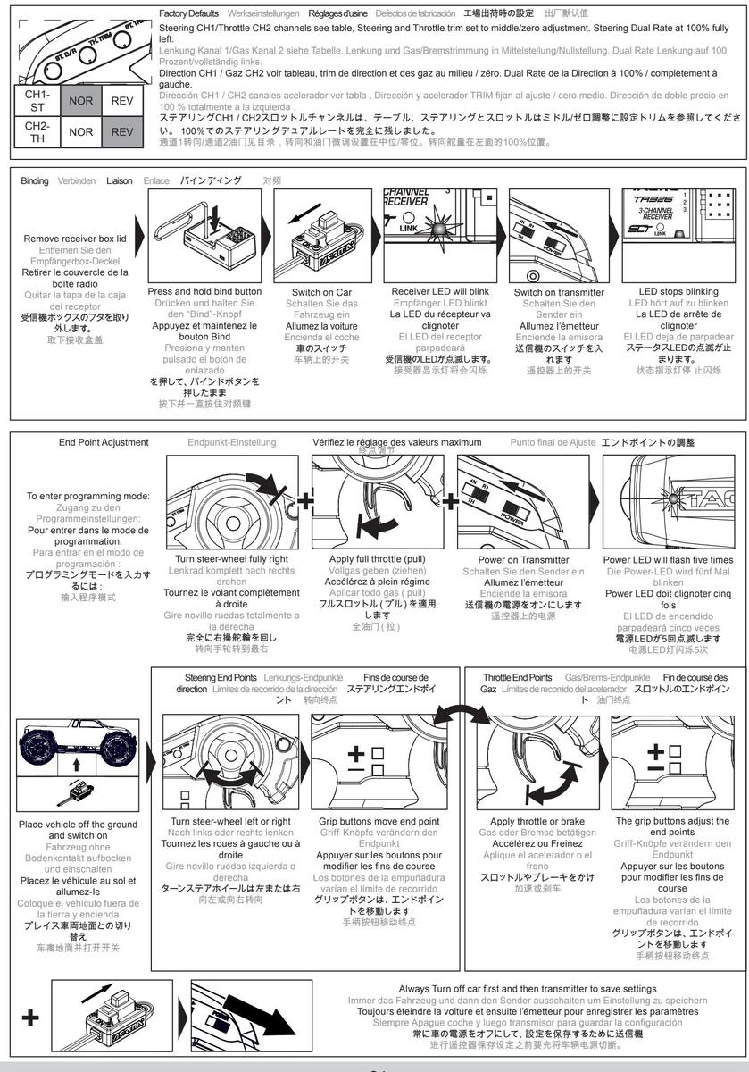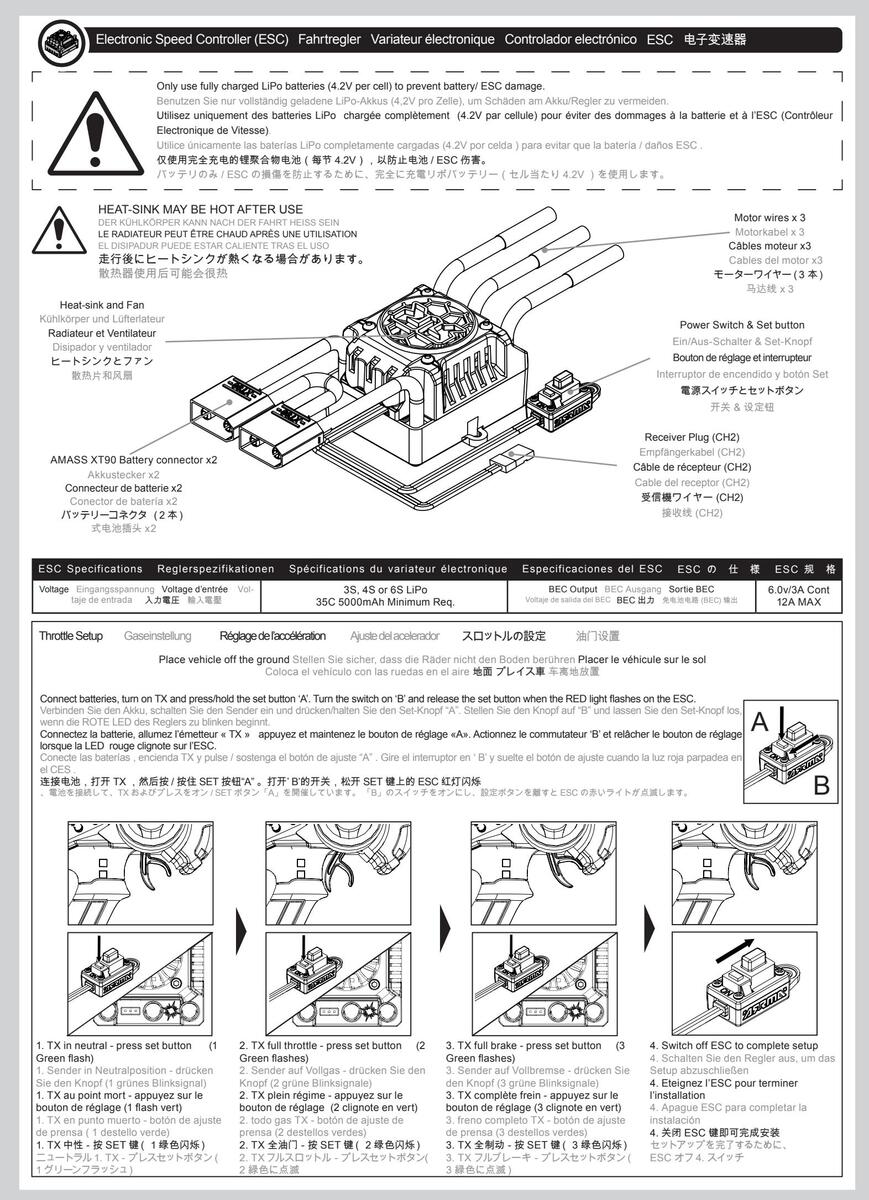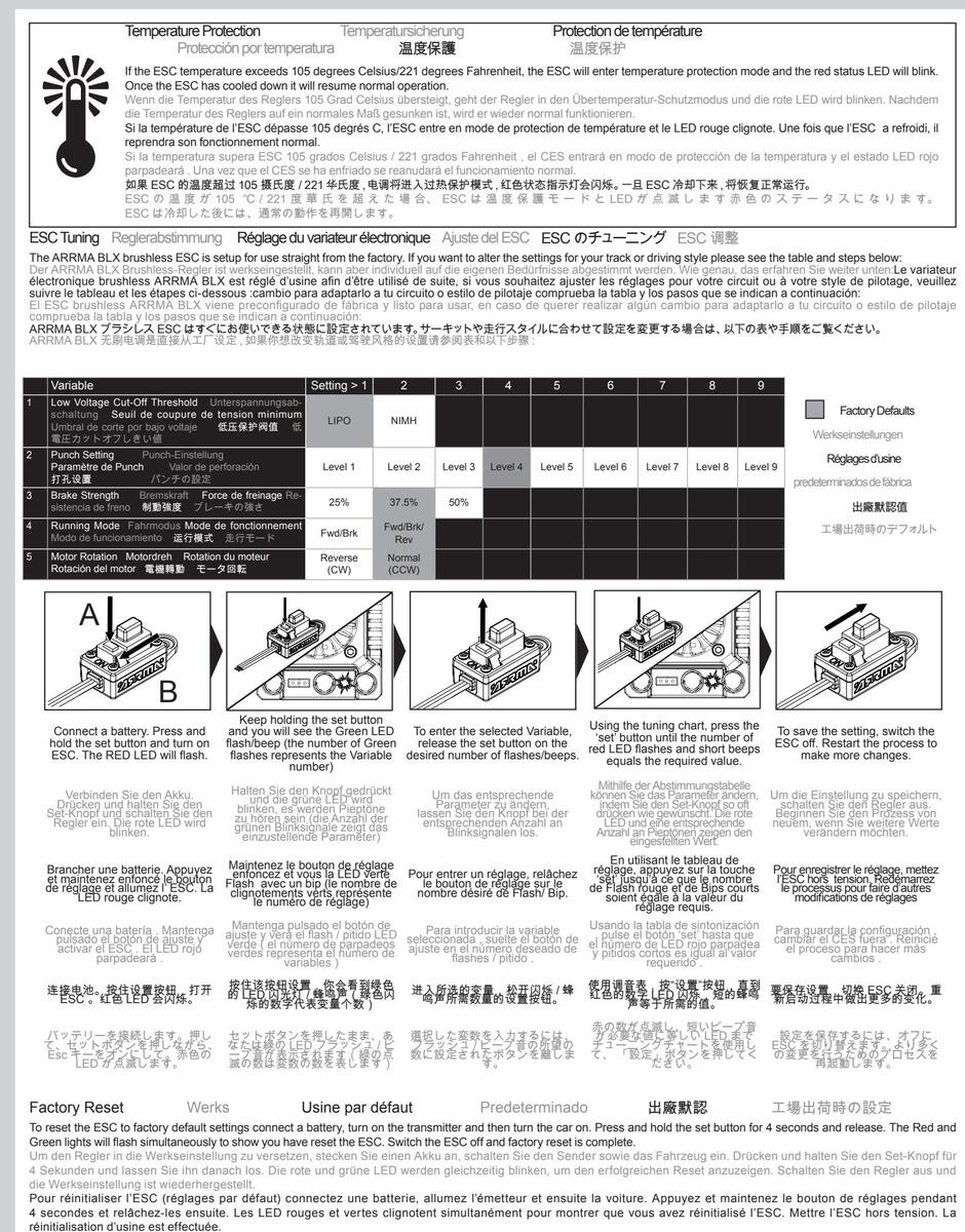 segundos y relaje. Las luces rojas y verdes parpadean simultaneamente para demostrar que na restablecido. Cample el CES apagado y reinicio de rabrica es completa. 要重置 ESC 到出厂默认设置连接电池,打开发射器,然后上车。按住 4 秒钟,然后松开设置按钮。红色和绿色灯将同时闪烁,以显示你已经复位。切换 ESC 关闭,恢复出厂设置就完成了。