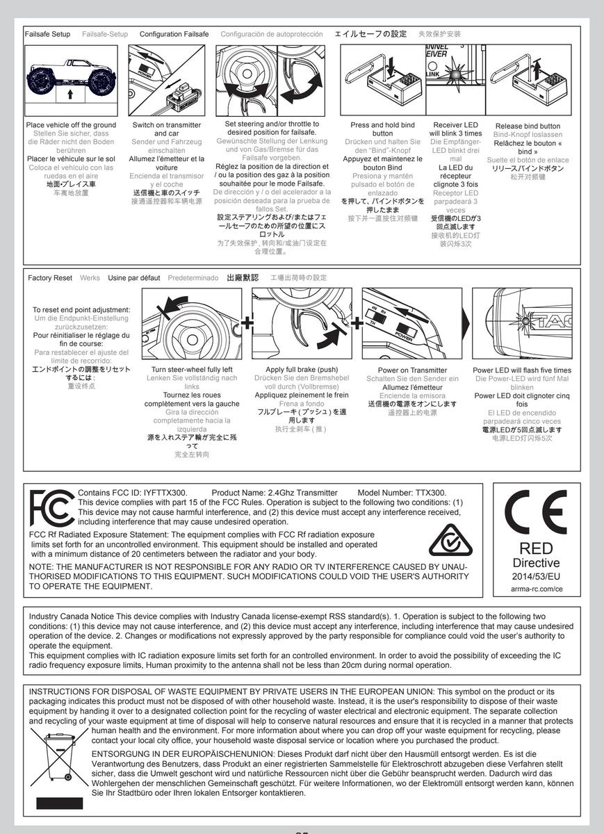 Vorsicht: Bei der Verwendung des falschen Akku-/Batterietyps kann es zu Explosionen kommen. Entsorgen Sie alte Akkus/Batterien immer entsprechend den beiliegenden Instruktionen 1. Verwenden Sie lediglich vier (4) AA-Alkali Batterien in Ihrem TTX300-Sender 2 Akkus/Batterien nicht ins Feuer werfen Explosionsgefahr! Befragen Sie im Zweifel Ihr lokales Entsorgungsunternehmen oder Ihren Fachhändler bezüglich der korrekten Entsorgung von alten/defekten Akkus/Batterien. 3. Offenen oder Beschädigen Sie auf keinen Fall Akkus/Batterien. Austretendes Elektrolvt ist ätzend und kann in Kontakt mit Augen und/oder Haut zu Verätzungen führen. Toxisch beim Verschlucken 4 Vermeiden Sie Kurzschlüsse und seien Sie Vorsichtig wenn Sie Ketten oder Ringe tragen, da auch diese Kurzschlüsse hervorrufen können. Akkus oder leitendes Material kann heiß werden und Verbrennungen hervorrufen Attention: Risque d'explosion si la batterie est remplacée par un type de batterie incorrect. Jetez les piles usagées selon les instructions. 1. Utilisez unique d'explosion si la batterie est remplacee par un type de batterie inc. 2. Ne jetez pas la batterie au feu car elle pourrait exploser. Vérifiez les consignes local des déchets pour connaître la procédure d'élimination. 3. Ne pas ouvrir ni mutiler les piles. L'électrolyse est corrosive et peut causer des dommages aux yeux et sur la peau. Elle peut être toxique si elle est 4. Faire preuve de prudence lors de la manipulation des piles afin de ne pas court-circuiter avec des matériaux conducteurs tels que baques, bracelets et clés. Les batteries ou la conduction peuvent surchauffer et causer des brûlures Precaución: Riesgo de explosión si la batería es sustituida por otra de tipo incorrecto. Deseche las baterías usadas siguiendo las instru 1 Utilice sólo cuatro (4) baterías alcalinas AA en su emisora TTX300 2. No deseche la batería quemándola ya que podría explotar. Compruebe las regulaciones locales para posibles instrucciones especiales para su desecho. 3. No abra ni corte la batería. El electrolito desprendido es corrosivo y podría causar daños en piel y oios. Puede resultar tóxico en caso de ingestión 4. Ponga especial cuidado al manejar las baterías para evitar cortocircuitos con materiales conductores como anillos, pulseras o llaves. La batería o el material conductor podrían calentarse y causar quemaduras. 注意:バッテリを間違ったタイプと交換すると爆発の危険性がある。指示に従って使用済み電池を処分。 1. あなたのラジオ TTX300 で唯一の 4 (4) 単三アルカリ電池。 1. めなだのシンオ 11,500 て唯一の年(年)ギニアルカウ電池。 2 それが爆発する可能性が燃焼することによって、バッテリーに捨てないでください。可能な特別な廃棄手順については、地域の規制を確認してくだ さい こ、。 3. バッテリーを開けたり、不具ないでください。進化した電解液は腐食性であり、皮膚や目に損傷を引き起こす可能性があります。飲み込むと、それ は毒性であり得る。 は母住てのり待る。 そのような指輪 ブレスレットやキーなどの導雷性材料との短絡を避けるために バッテリーを取り扱うとき 4. 特別な注意を払ってください。バッテリーや導体が過熱して火傷の原因になります。 注章 · 爆炸危险 如果更换的电池类型不正确。按照说明处理废旧电池。 1. 只能使用 4 个 AA 碱性电池在电台 TTX300 。2. 不要通过燃烧可能发生爆炸处理电池。查阅当地有关可能的特殊处理的说明。 3. 不要打开或毁坏电池。演进的电解质有腐蚀性,可能会损害皮肤和眼睛。这可能是吞咽。4. 装卸电池,以避免短路导电材料,如戒指,手镯和钥匙要 5. 不要打开或致不电池。演近的电解应有腐蚀 特别小心。电池或导线可能会讨热并导致灼伤。