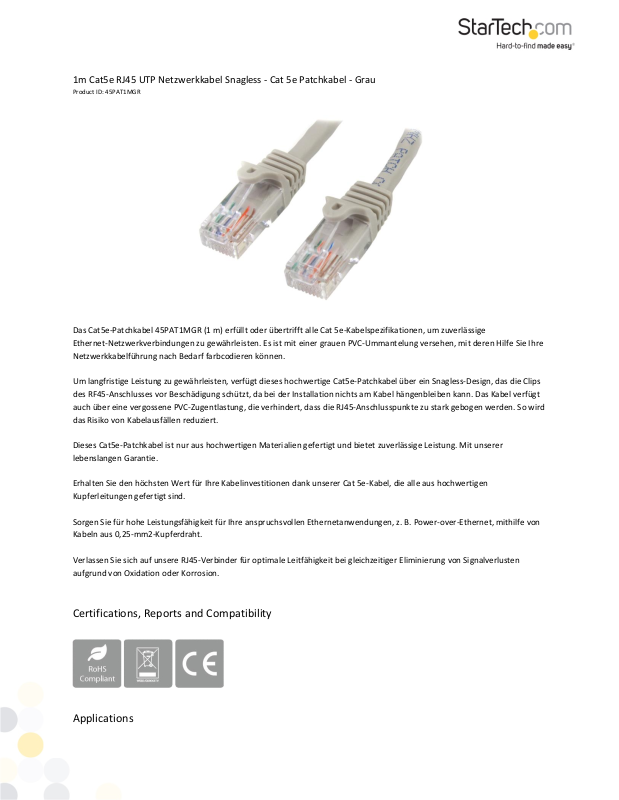 Das Cat5e-Patchkabel 45PAT1MGR (1 m) erfüllt oder übertrifft alle Cat 5e-Kabelspezifikationen, um zuverlässige