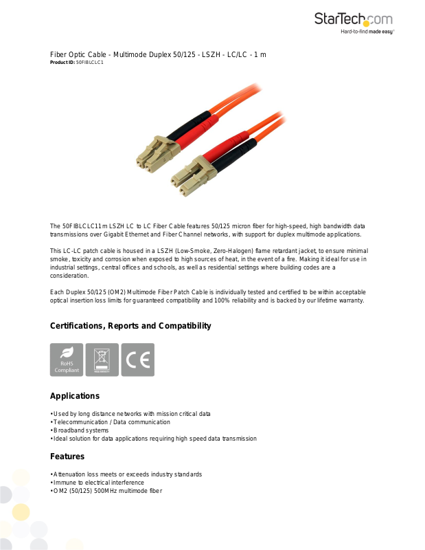 Each Duplex 50/125 (OM2) Multimode Fiber Patch Cable is individually tested and certified to be within acceptable
