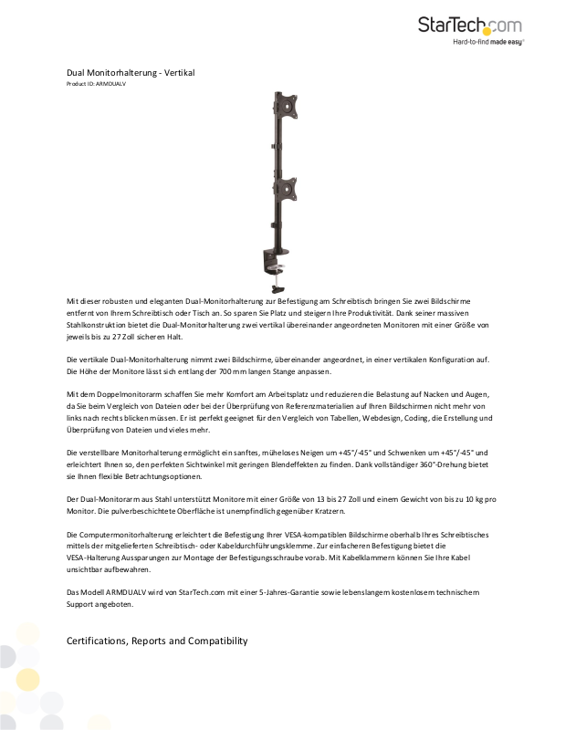 Das Modell ARMDUALV wird von StarTech.com mit einer 5-Jahres-Garantie sowie lebenslangem kostenlosem technischem