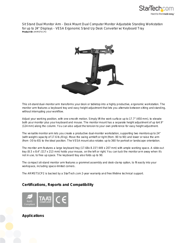 The ARMSTSCP2 is backed by a StarTech.com 2-year warranty and free lifetime technical support.