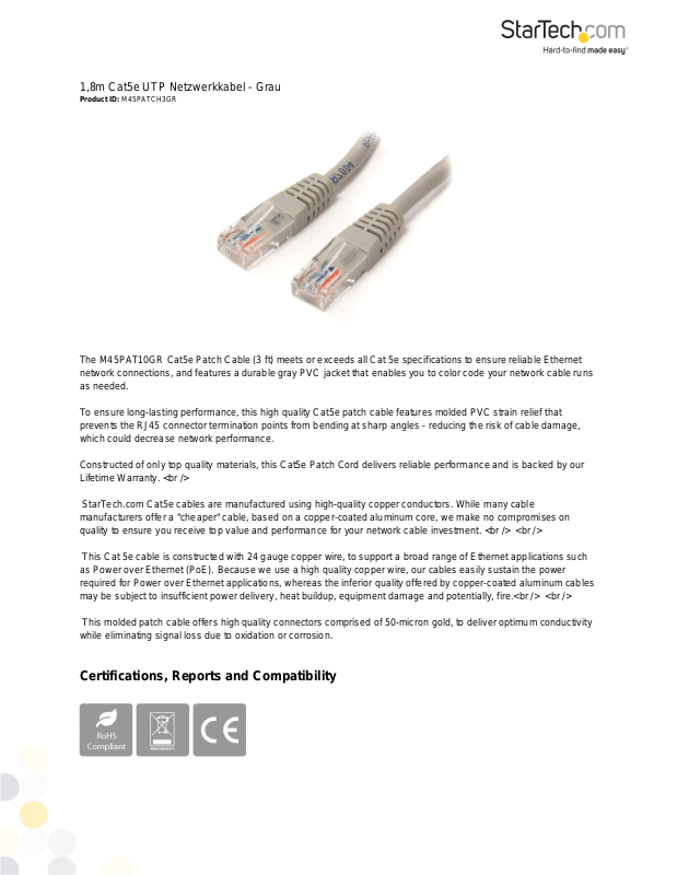 StarTech.com Cat5e cables are manufactured using high-quality copper conductors. While many cable