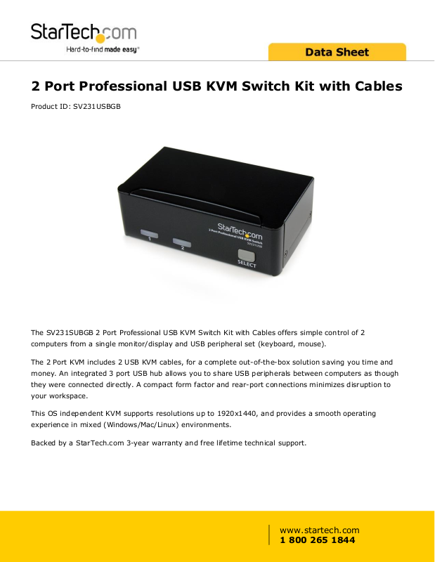 The SV231SUBGB 2 Port Professional USB KVM Switch Kit with Cables offers simple control of 2