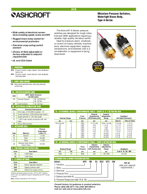 TO ORDER THIS A-SERIES PRESSURE SWITCH: