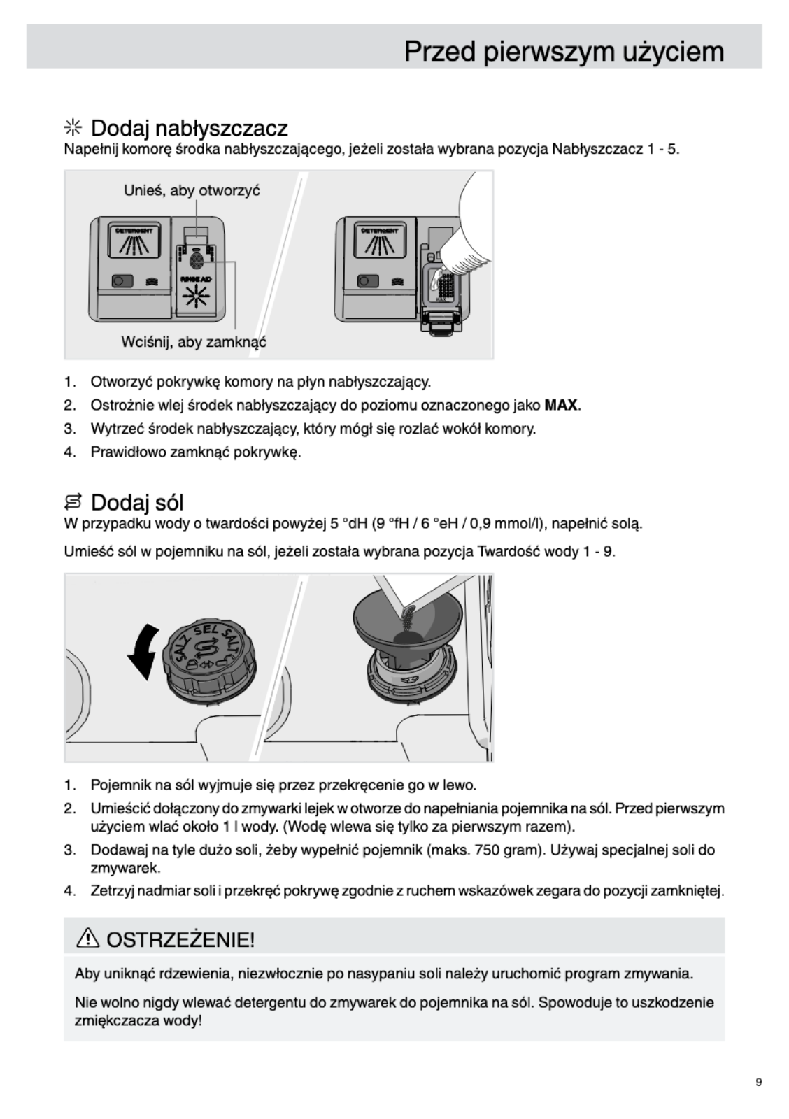 Wodę o twardości powyżej 5°dH (9°fH / 6°eH / 0,9 mmol/l) trzeba zmiękczać. Proces odbywa się automatycznie, z wykorzystaniem wbudowanego zmiękczacza wody. Prawidłowe działanie zmiękczacza wody wymaga nastawienia go odpowiednio do twardości doprowadzanej wody. Po ustawieniu zmiękczacza wody używać detergentu i środka nabłyszczającego w ilościach odpowiednich dla miękkiej wody.