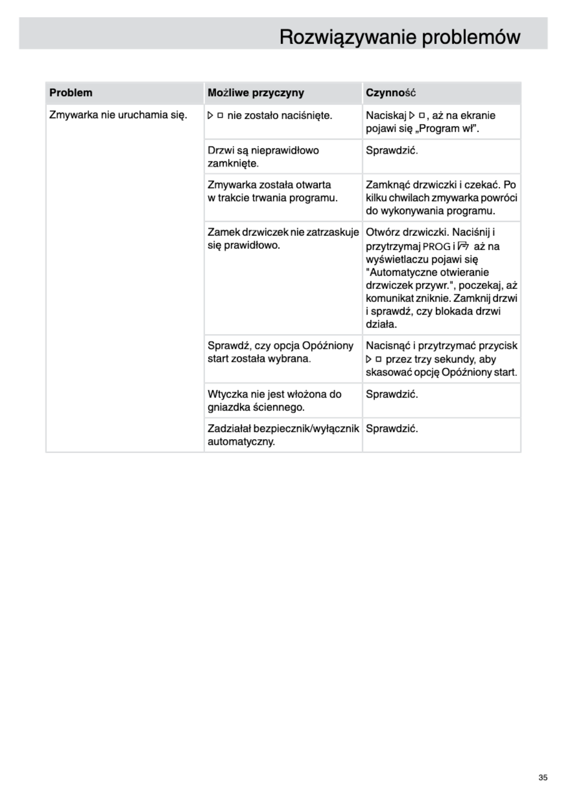 | W zmywarce pozostaje woda. | Filtry są zapchane. | Wyczyścić filtr wstępny i filtr dokładny. |