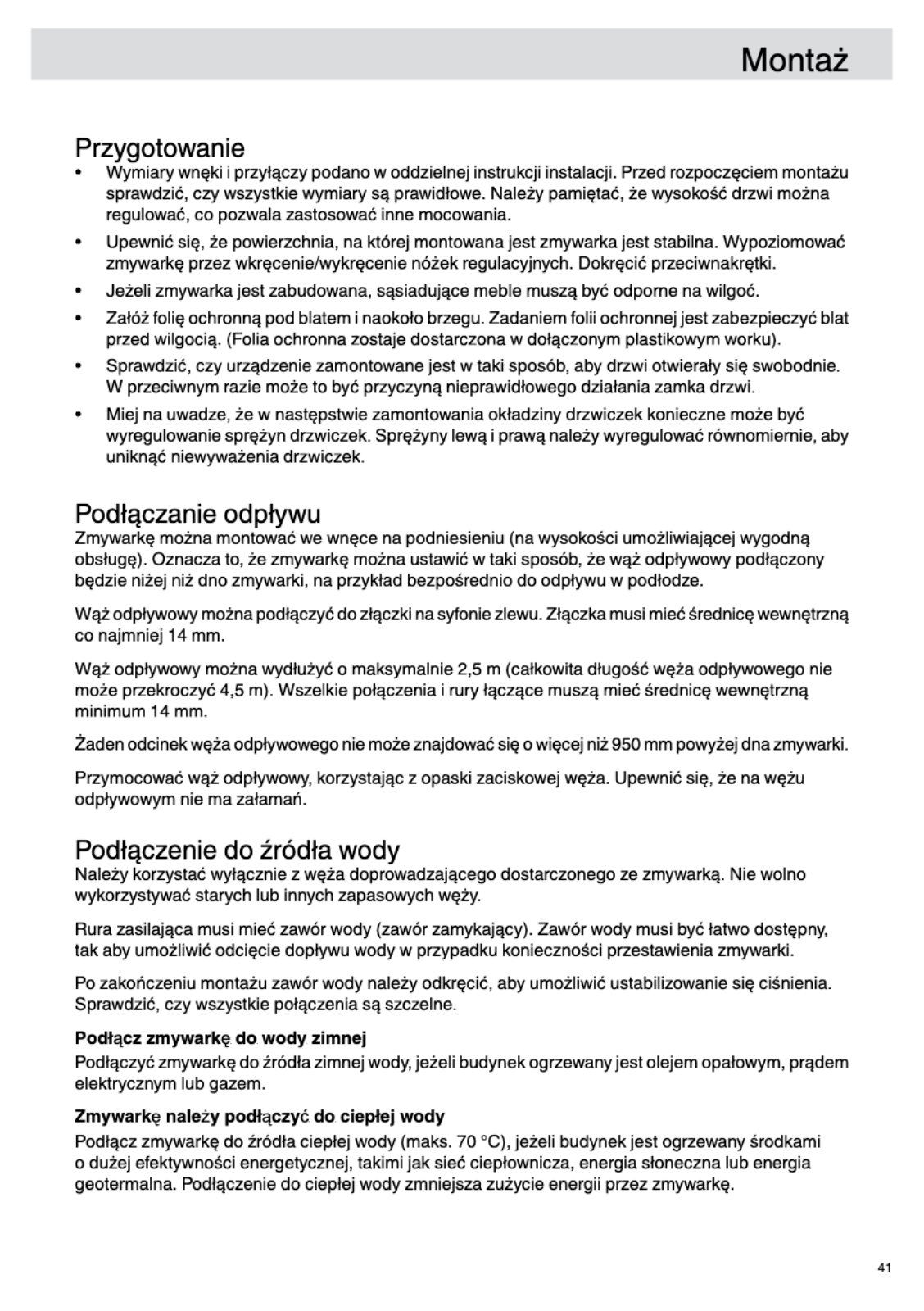 Elektryczne gniazdko ścienne musi znajdować się poza miejscem montażu oraz być łatwo dostępne po zamontowaniu zmywarki. Nie wolno stosować przedłużaczy.