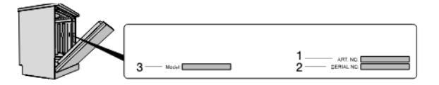 W zgłoszeniu należy podać informacje zamieszczone na tabliczce znamionowej zmywarki, włącznie z numerem artykułu (1), numerem seryjnym (2) i nazwą modelu (3).