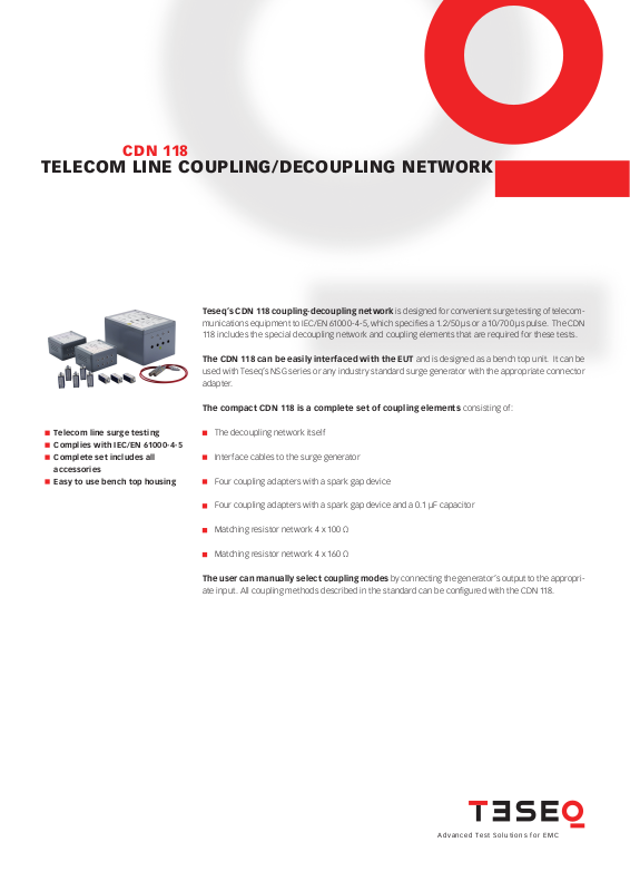 Teseq’s CDN 118 coupling-decoupling network is designed for convenient surge testing of telecom-