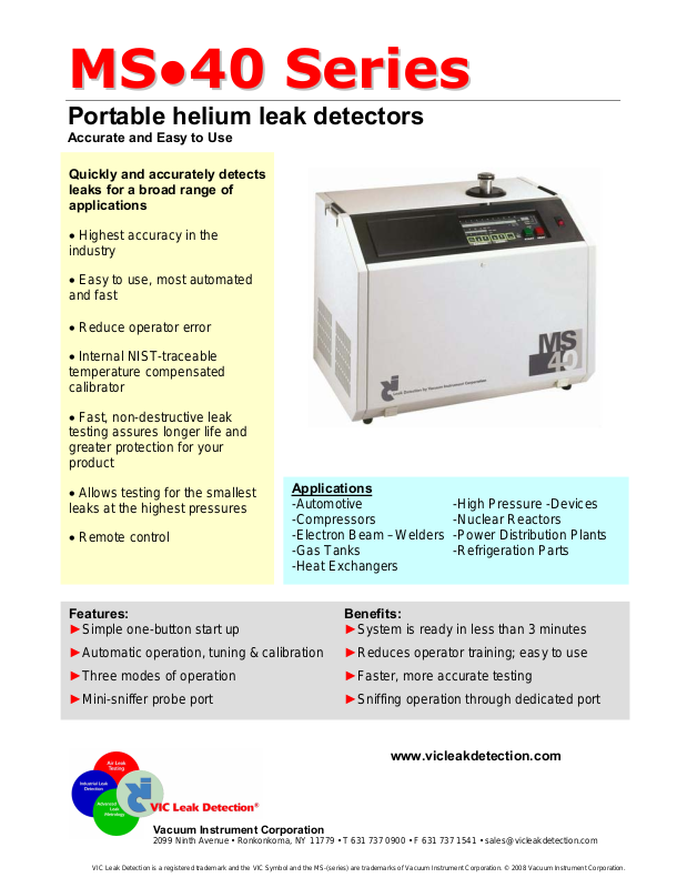 VIC Leak Detection is a registered trademark and the VIC Symbol and the MS-(series) are trademarks of Vacuum Instrument Corporation. © 2008 Vacuum Instrument Corporation.