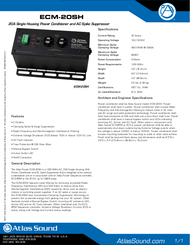 Power conditioner shall be Atlas Sound model ECM-20SH. Power