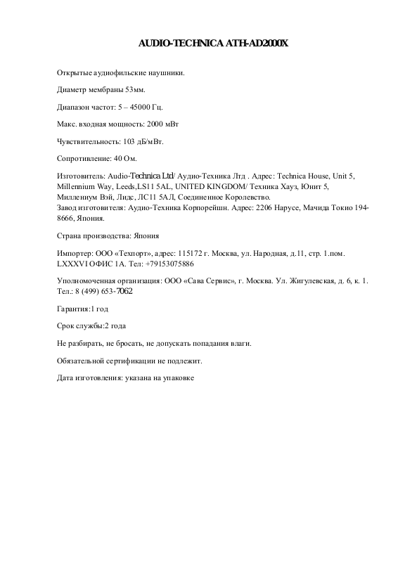Изготовитель: Audio-Technica Ltd/ Аудио-Техника Лтд . Адрес: Technica House, Unit 5,