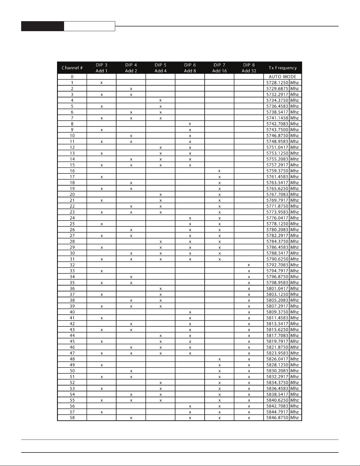 The operation of the AW5800iT and AW5800xT can be restricted to a specic channel within the 5.8 GHz band by setting DIP