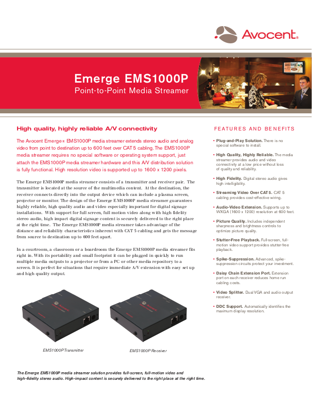 The Avocent Emerge® EMS1000P media streamer extends stereo audio and analog