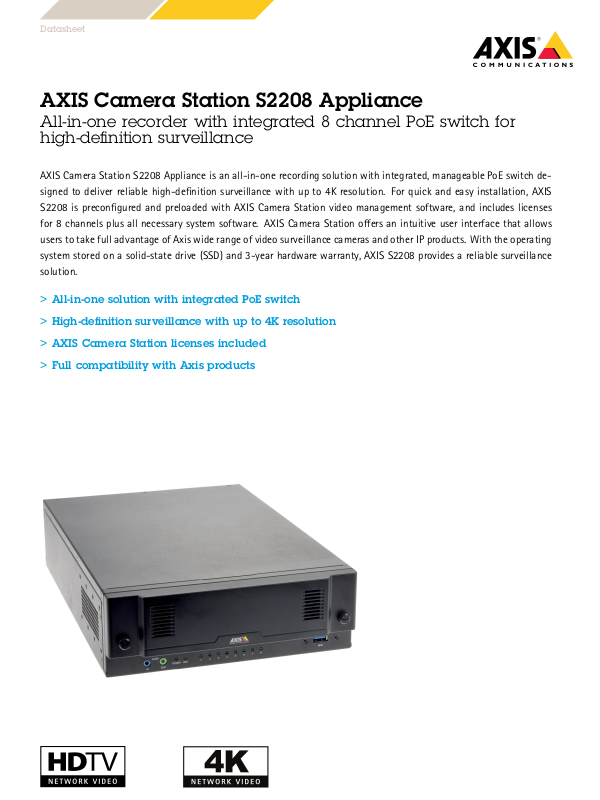 AXISCameraStationS2208Applianceisanall-in-onerecordingsolutionwithintegrated,manageablePoEswitchdesignedtodeliverreliablehigh-denitionsurveillancewithupto4Kresolution.Forquickandeasyinstallation,AXIS