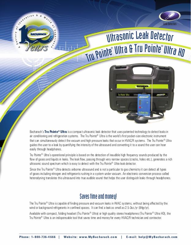 Bacharach’s Tru Pointe® Ultra is a compact ultrasonic leak detector that uses patented technology to detect leaks in
