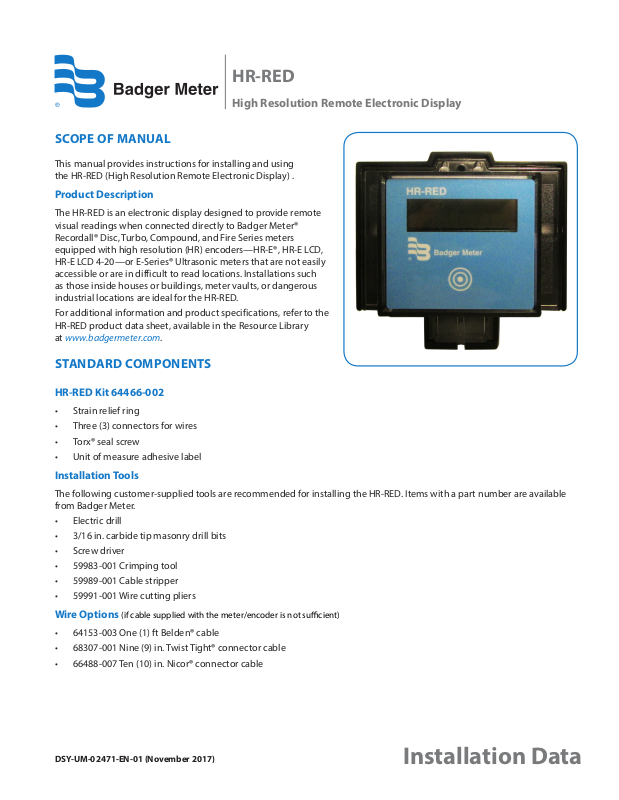 The HR-RED is a battery operated device. When attached to Badger Meter high resolution encoders or high resolution E-Series