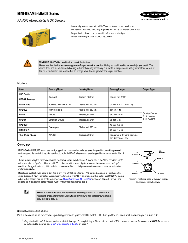 switching amplifiers with intrinsically safe input circuits. MIAD9 Series sensors are designed in accordance with DIN 19