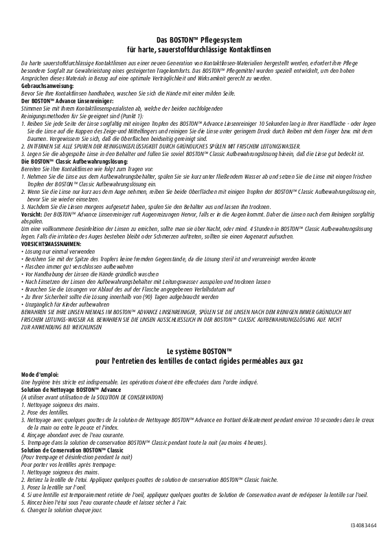 Vorsicht: Der BOSTON™ Advance Linsenreiniger ruft Augenreizungen Hervor, falls er in die Augen kommt. Daher die Linsen nach dem Reinigen sorgfältig