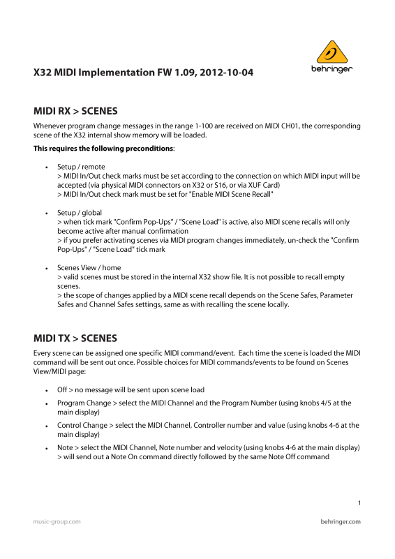 Behringer X32 midi Implementation