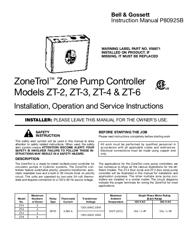 too numerous to show all the various illustrations for the different models. The ZT-4 (four zone) and ZT-2 (two zone) pump