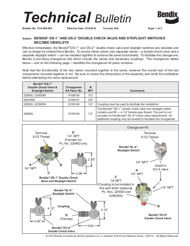 Effective immediately, the Bendix® DS-1™ and DS-2™ double check valve and stoplight switches are obsolete and