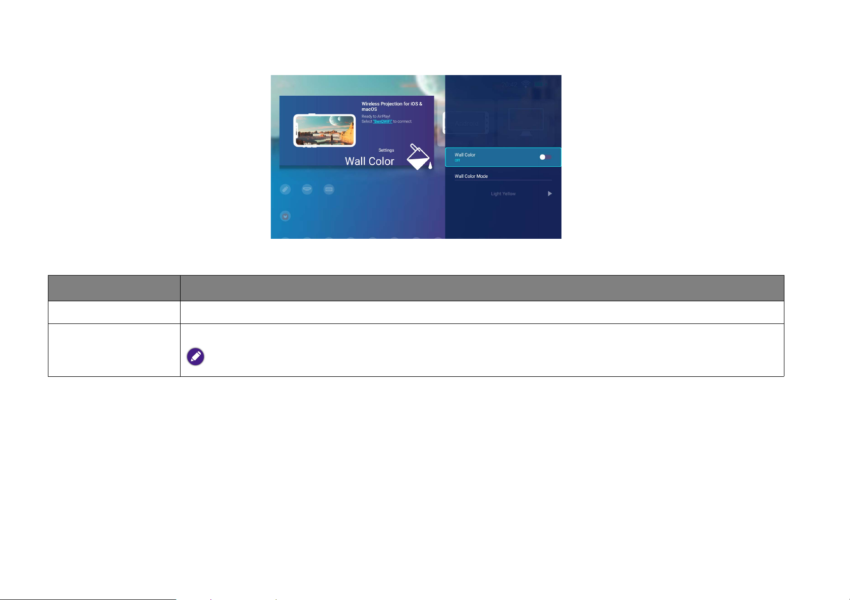 WandfarbePasst die Farbeinstellungen des Bildes an, um der Farbe der Wand zu entsprechen, auf der das Bild projiziert wird.