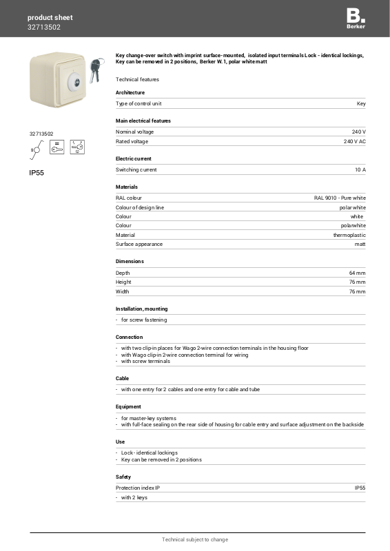 Key can be removed in 2 positions, Berker W.1, polar white matt