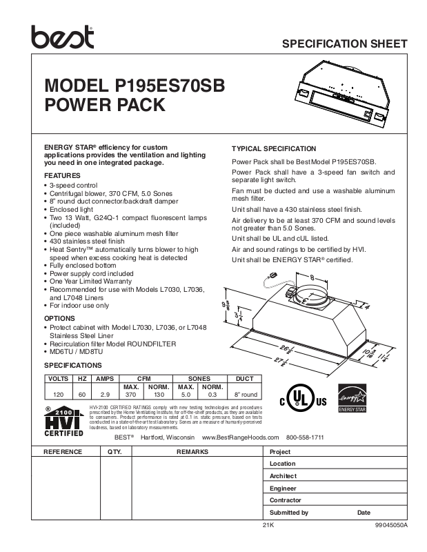 BEST® Hartford, Wisconsin www.BestRangeHoods.com 800-558-1711