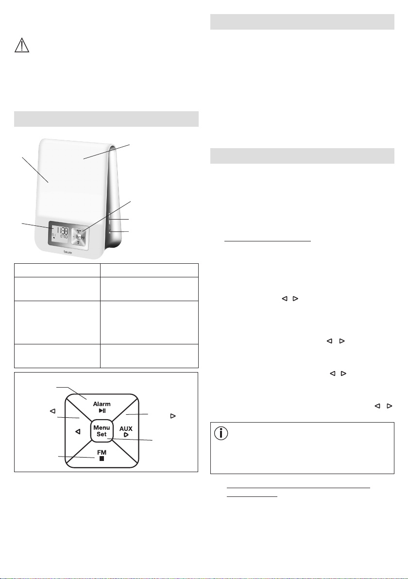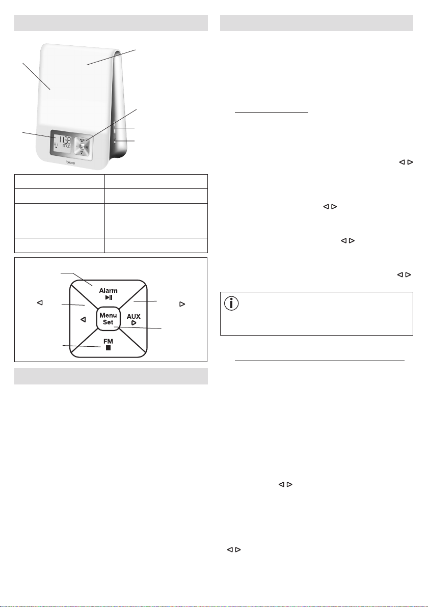 simulierten Sonnenaufgang ertönt und Sie beim Aufwachen akustisch unterstützt. Als Weckton stehen Ihnen Radio und verschiedene Klänge zur Verfügung. Der beurer