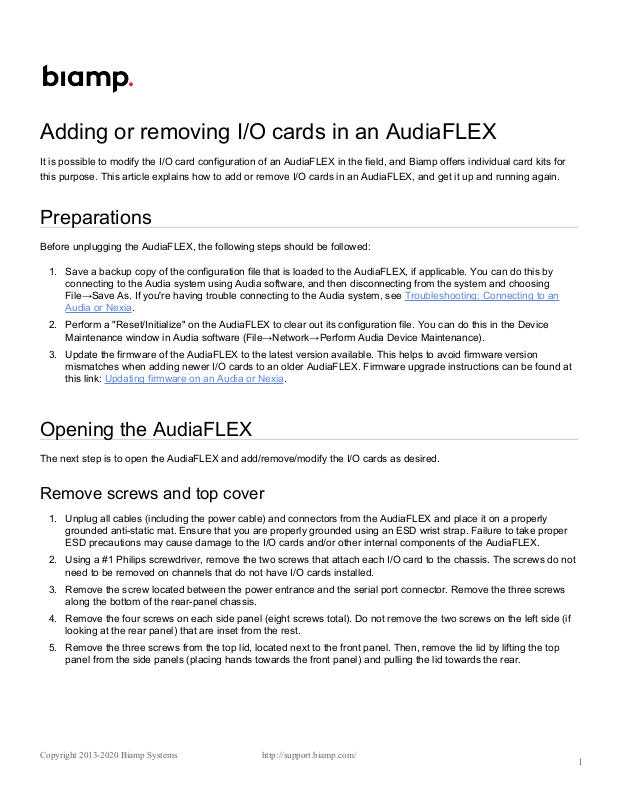 this purpose. This article explains how to add or remove I/O cards in an AudiaFLEX, and get it up and running again.