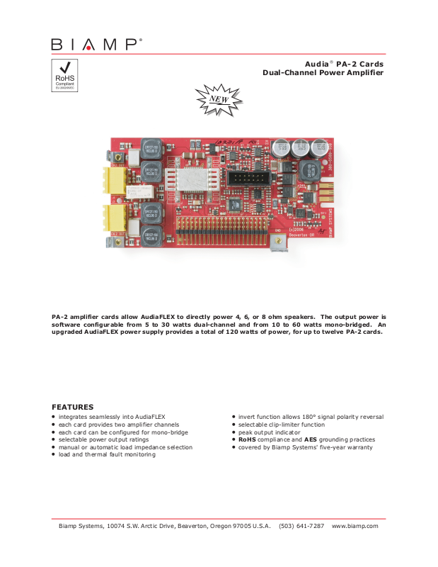 PA-2 amplifier cards allow AudiaFLEX to directly power 4, 6, or 8 ohm speakers. The output power is
