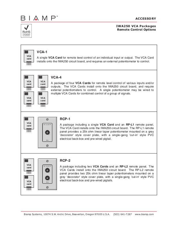 outputs. The VCA Cards install onto the IWA250 circuit board, and require