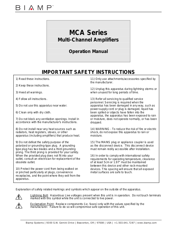 Connections are provided for remote control of channel levels & muting. MCA Series amplifiers are covered by Biamp Systems' fiveyear warranty.