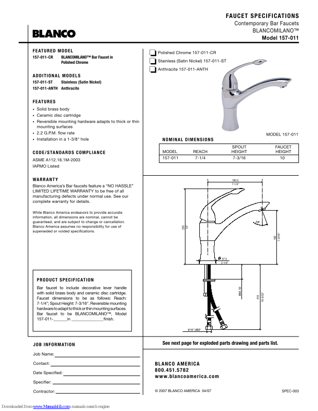 Blanco 157-011-CR, 157-011-ST, 157-011-ANTH Specifications