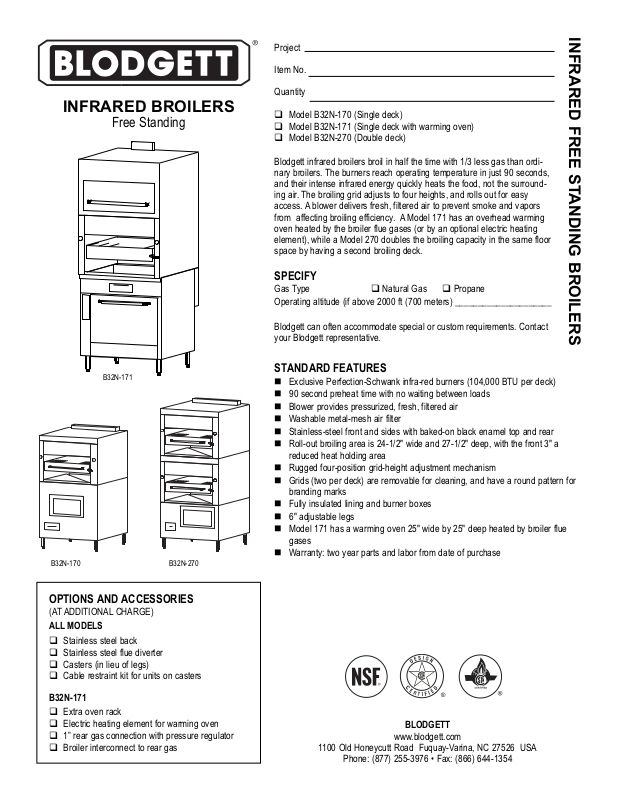 The item shall be a [single-deck | double-deck] infrared broiler [with an overhead warming oven]. The broiler burners shall total 104,000 BTU with separate controls. The front and sides