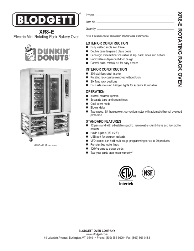 Provide Blodgett electric mini rotating rack bakery oven model XR8-E. Unit shall have a single compartment with fully welded angle iron frame, and 304 stainless steel interior. Unit shall